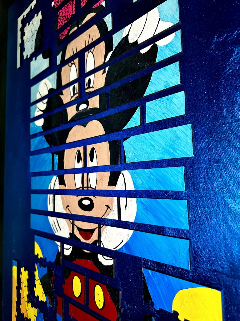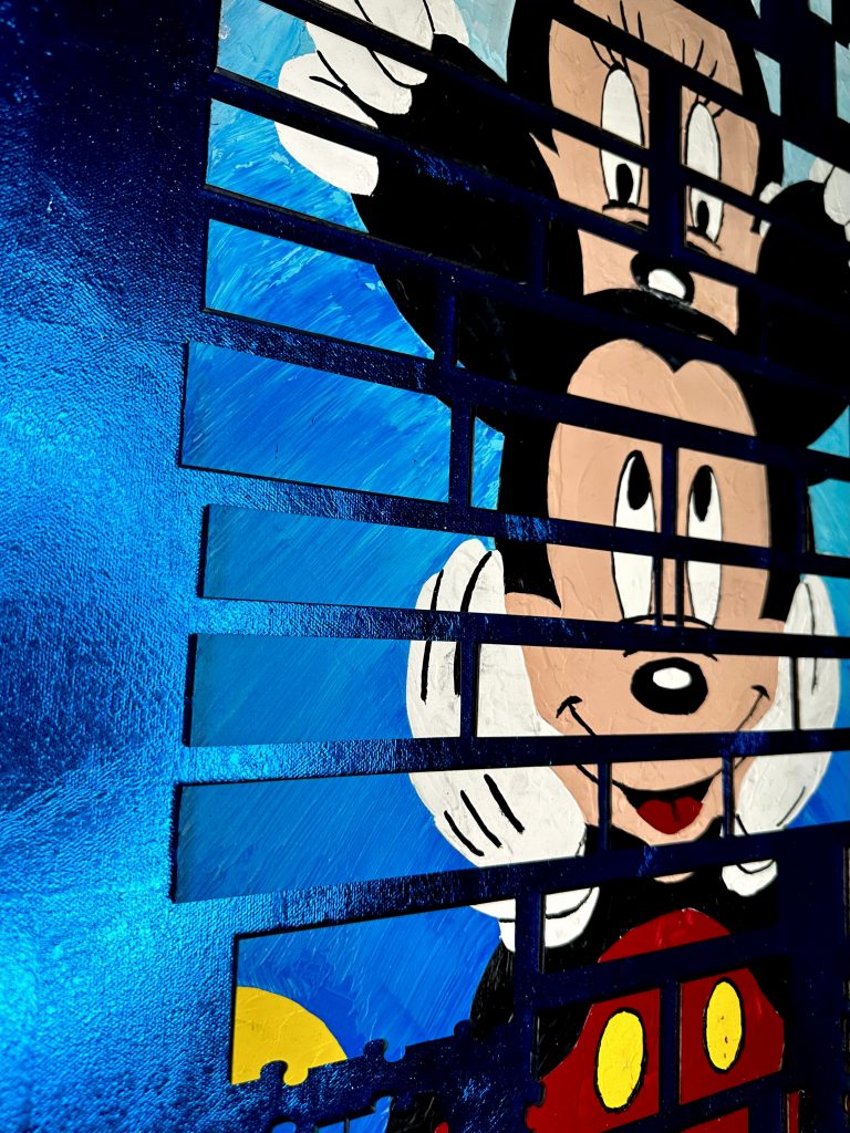 Minnie verbirgt sich hinter Micky, doch ihre Präsenz ist unübersehbar. Ein Spiel mit Sichtbarkeit und Verbundenheit, zerlegt in Puzzlestücke, die gemeinsam ein Ganzes ergeben. Zwei Legenden. Eine Einheit.