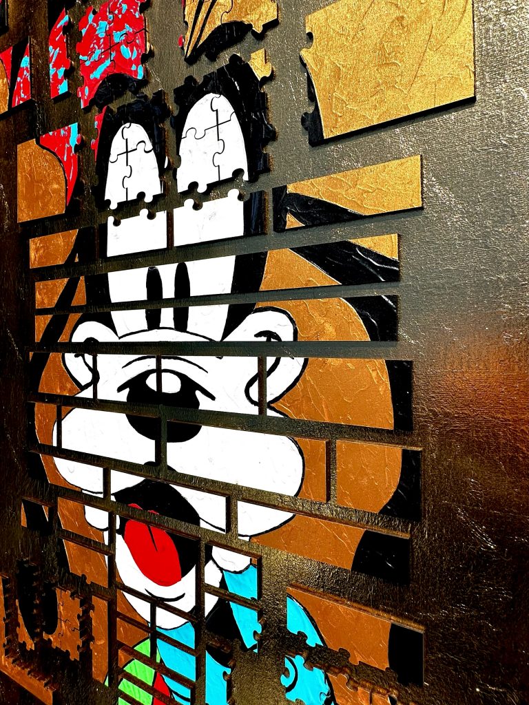 Wenn Pop-Art auf Puzzle trifft und Goofy sich in Einzelteile auflöst – willkommen in der vergoofyzierten Realität! Dieses Werk spielt mit Fragmentierung, Struktur und dem goldenen Glanz der Nostalgie. Zerlegt, verdreht, neu zusammengesetzt – genau wie unsere Erinnerung an Kindheit, Chaos und Cartoons.